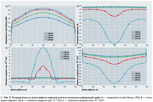 Электропроводность грунта 0,02 См/м как обратная величина удельного сопротивления 50 Ом·м соответствует, согласно вышеуказанному ГОСТ, мягкой глине. Учтена возможная продольная деформация трубопровода от перемещения прилегающего к нему грунта в пределах 1,5– 2,25 мм. Исходные параметры исследования могут варьироваться, что позволяет оценивать коррозионный процесс в широком диапазоне возможных условий эксплуатации трубопроводов.